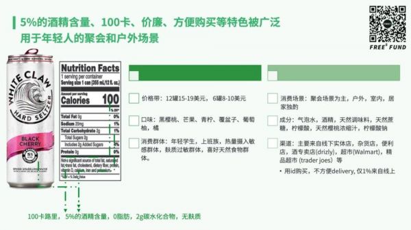 从产品定位来看,White Claw的消费场景和啤酒类似,以人多的派对、校园活动、户外运动、流行音乐会等为主,它和美国社交场景紧密结合。它的价格也与普通啤酒相当,但是比啤酒好入口,可以融合丰富的果味,口感像汽水一样。与此同时,它采用易拉罐包装,非常便于带到海滩、公园、泳池等场景。