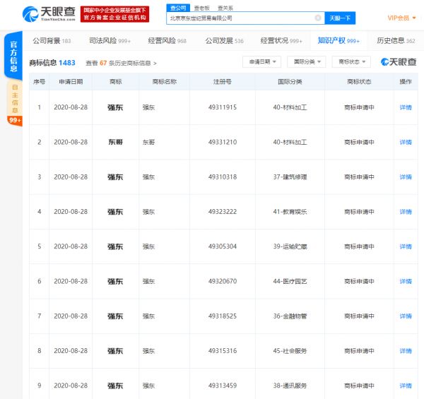 天眼查APP显示,近日,北京京东世纪贸易有限公司新增多条商标信息,其中包括多条“东哥”、“强东”的商标,申请日期在2020年8月28日,商标状态均显示为“商标申请中”。涉及国际分类包括材料加工、教育娱乐、建筑修理、运输贮藏、科学仪器、网站服务等。
