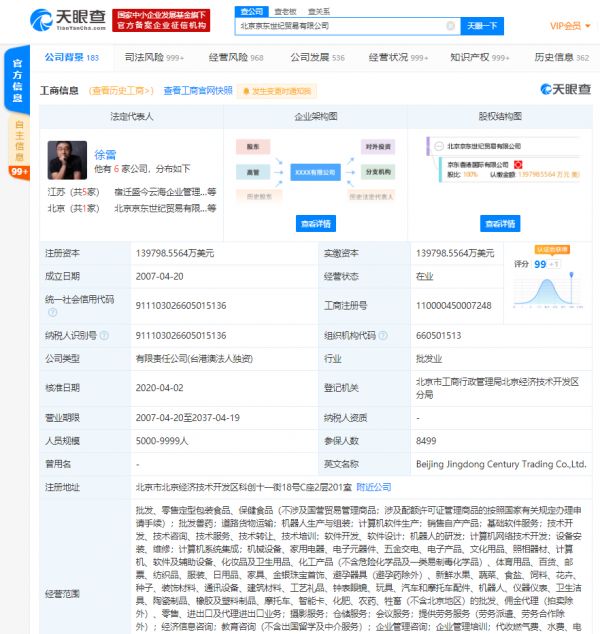 北京京东世纪贸易有限公司成立于2007年4月20日,注册资本约为14亿美元,法定代表人为徐雷。公司经营范围包括批发、零售定型包装食品、保健食品;批发兽药;道路货物运输;机器人生产与组装;计算机软件生产;销售自产产品;基础软件服务;技术开发、技术咨询等,由京东香港国际有限公司全资持股。