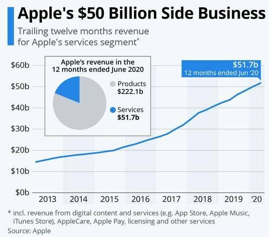 尽管510亿美元的年收入已超出了大多数公司梦寐以求的目标,但对于苹果公司如此大的规模而言仍然仅占一小部分。在截至2020年6月的12个月中,该公司产品销售额达到2220亿美元,硬件产品仍占其总营收的80%以上。