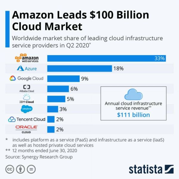 这个时候,美国的云计算行业也发生了微妙的变化,随着亚马逊在零售、医疗健康等多个领域加大了拓展力度,越来越多的传统行业企业舍弃了AWS平台转投微软和Google,其中就有沃尔玛、Kroger等零售巨头,以避免自己的业务和数据在潜在竞争对手的平台上运行和存储。最终带来的结果是云计算平台出现了三强鼎立的局面,之后的IBM和甲骨文离亚马逊、微软和Google组成第一梯队越来越远。甲骨文几乎要被这个行业所抛弃。