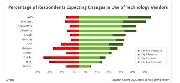 另外一方面来说,业务收入的快速流失也逼迫甲骨文把全力发展云计算业务作为自己的生命线。甲骨文原有的企业客户正倾向于选择租用服务器时间和软件使用权,并削减内部IT系统上的软件许可和软件服务预算,而这一部分预算本来是甲骨文的核心收入来源。根据Flexera 2020年针对企业IT管理层的调查统计显示,甲骨文是未来在IT部门中削减投资最多的厂商,甚至高于老对手IBM。