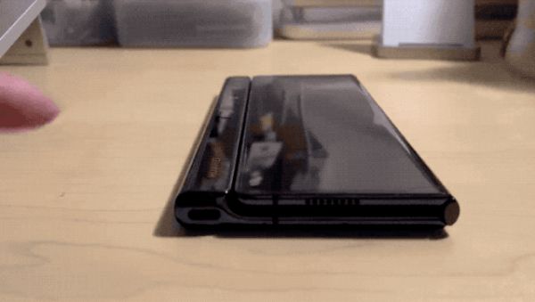 横向内折叠的代表就是三星的 Galaxy X Fold 2,通过把屏幕放在折叠角度内侧,左右水平折叠合上,Fold 2 成功把一块 7.6 英寸屏幕做到 6.2 英寸左右的机身内,合上时可以使用另一块 6.2 英寸的外屏。