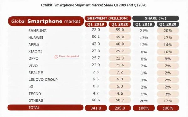 2020 年第一季度手机市场相关数据. 图片来自:Counterpoint