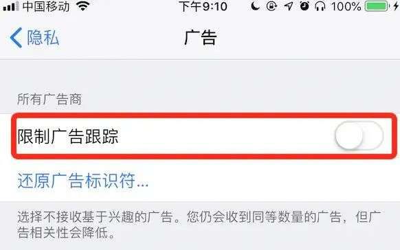 打开“设置”,进入“隐私”,选择“广告”,打开“限制广告跟踪”,“重置广告标识符”。
