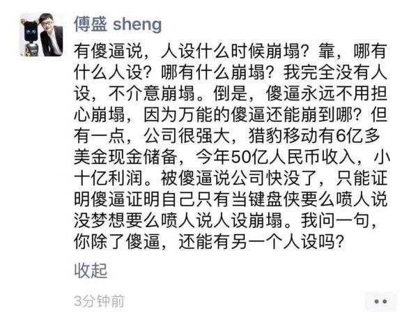 傅盛是自信的,曾经有媒体人在朋友圈批评傅盛,质疑“公司都做没了,还不忘做秀”,还有网友设问傅盛人设何时崩塌。傅盛在朋友圈直接开喷:“有傻X说,人设什么时候崩塌?我完全没有人设,不介意崩塌。”