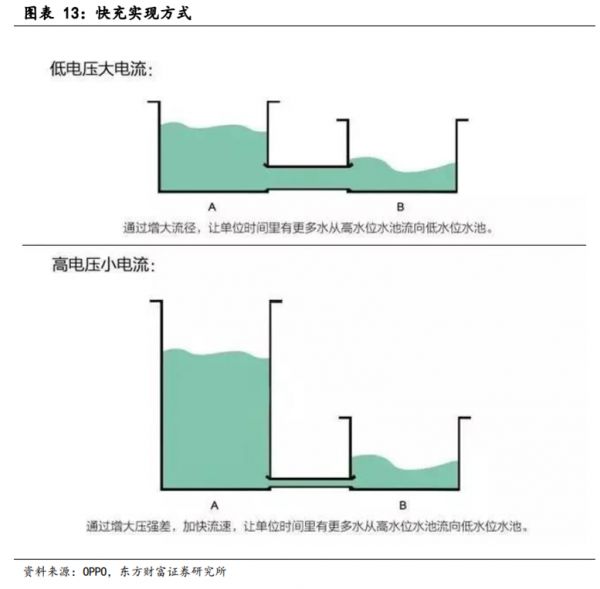 协议看起来很多,但无非就是电压和电流上做学问。通俗来说,充电的过程就像是从大水库向小水库注水,电压相当于水压,电流就相当于水流,水库来代表电池。提高电压就是通过增大水位差来增加水流速度,增加电流就是拓宽水库间的水管宽度。