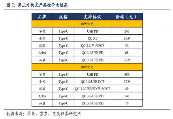 而且,苹果的举动或许也会提升快充产品的价格。毕竟,苹果原装普通的也卖到了150元以上,这要比现在七八十元的快充,还是高了不少。从替代效应而言,快充也不是不可以涨涨价。