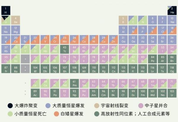 这张元素周期表展现了元素的宇宙起源,不同色块的面积代表不同起源所占的比例。| 图片设计:雯雯子;参考素材:NASA