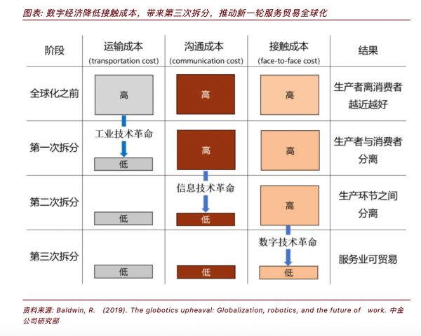 随着数字经济的发展,服务商品开始逐渐占据主流,面对面的接触成本降低,让原先一些不可交易的服务贸易产品开始进入流通环节。例如,以服装产业为例,很多时候下订单的厂家都会派人前往代工厂负责设计的定稿,监工和质检环节。但是,随着数字技术的发展,越来越多的操作可以通过网络解决,接触成本的下降,将让生产效率进一步提高。这就让原先无法相互接触的人,借助数字经济进行贸易,这背后则是以技术所支持的服务贸易。