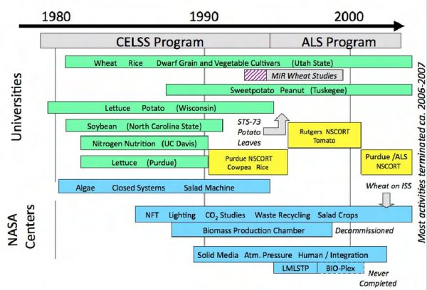 进入20世纪70年代末期,美国国家航空航天局NASA开始运作一个名为CELSS(Controlled Ecological Life Support)的研究部门,后又演变为ALS(Advanced Life Support)项目,以研究在失去地球自然生态的太空中,如何以可行的人工方式种植作物。在完全封闭的人工控制系统中,优化光照、温度、相对湿度、空气流通及营养肥料组合,寻求粮食作物种植方法。从一下面的项目进程图中可以看到,所试验的作物范围广泛,包括小麦、稻米、大豆、土豆以及如今垂直农场主流的绿叶蔬菜。