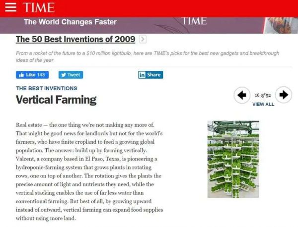 Time时代杂志将Valcent的垂直农场系统评为50个顶尖发明之一