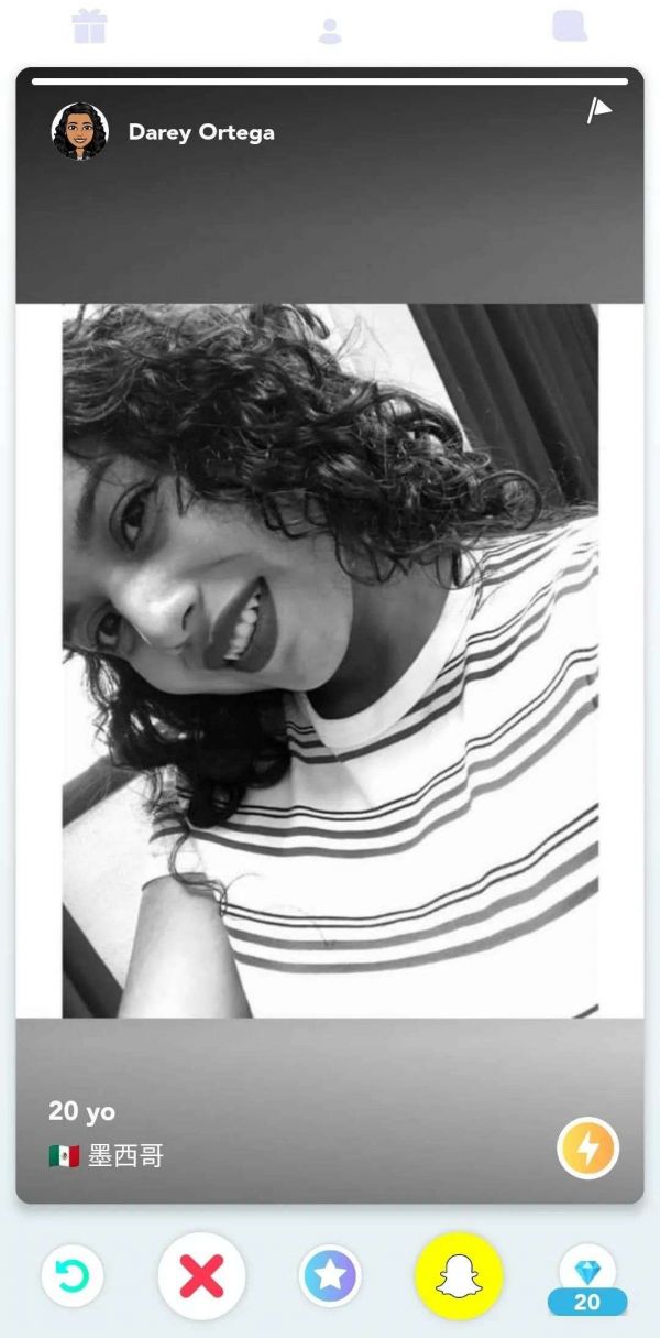 从笔者观察到的这些 App(当然很片面),接入 Snapchat 来做约会交友的产品占了大多数,而且玩法比较类似,在主页中会刷新出其他用户的图片或信息,如果不感兴趣可以跳过,如果感兴趣可以在 Snapchat 上加好友交流。