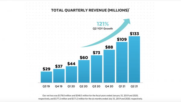 根据招股书,Snowflake2020财年(截止至2020年1月31日)营收为2.65亿美元,同比增长174%;而到2020年7月31日,其营收达到2.42亿美元,同比增长达到133%,预计全年营收超过5亿美元。