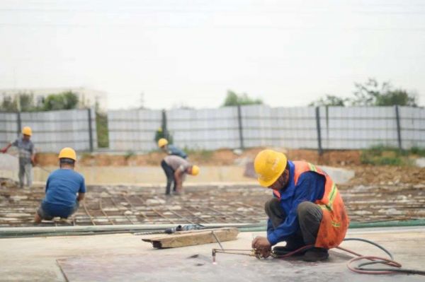 施工现场,你能看到有关传统基建行业里的所有元素:穿着工服带着安全帽的成群的工人穿梭在工地上;大片的钢材被切割焊接,铁屑和火花四溅;大型器械设备运行发出巨大的轰鸣……这是典型的工地施工场景,也符合所有人对基建行业的想象。