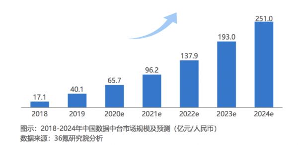 数据中台作为数智化落地的助推器,市场潜力巨大,行业玩家也正在积极探索与拓宽数据中台的应用场景与服务内容,根据36氪研究院的数据,预计2020年后,数据中台将实现爆发式增长,到2024年,市场规模将从2019年的40.1亿元增长至251亿元。