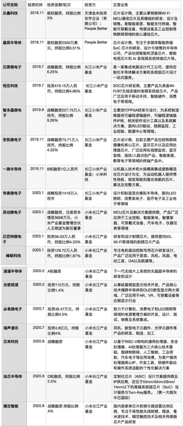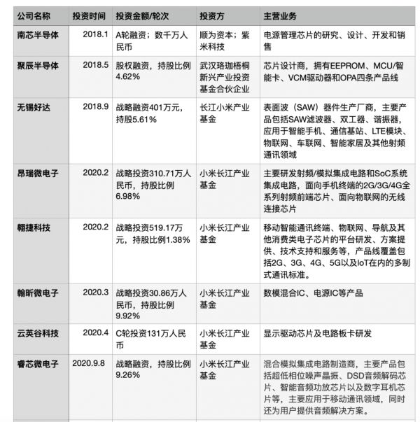 后期小米投资的与手机相关企业并不算多,包括昂瑞微电子、云英谷科技、翱捷科技、翰昕微电子、睿芯微电子等。分别负责手机射频芯片、显示驱动芯片、快充芯片、基带芯片和开关芯片设计。