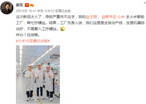 小米新品太火,想去工厂帮忙拧螺丝,结果工厂负责人说,“我们这里是全自动产线,全是机器自动拧,不需要人工拧螺丝。”