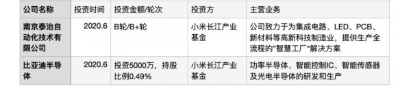 在投资方面,小米的半导体投资名单中也罕见的出现了两家芯片制造企业,南京泰治自动化技术有限公司、比亚迪半导体。