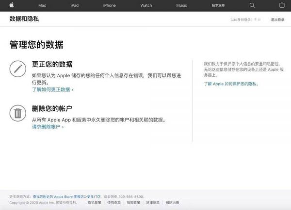 打开“数据和隐私”页面,用户能够自主更新个人数据或删除账户 | Apple