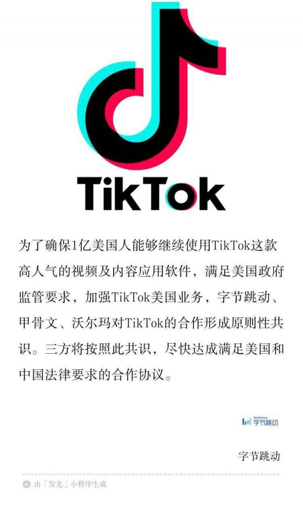 为了确保1亿美国人能够继续使用TikTok这款高人气的视频及内容应用软件,满足美国政府监管要求,加强TikTok美国业务,字节跳动、甲骨文、沃尔玛对TikTok的合作形成原则性共识。三方将按照此共识,尽快达成满足美国和中国法律要求的合作协议。