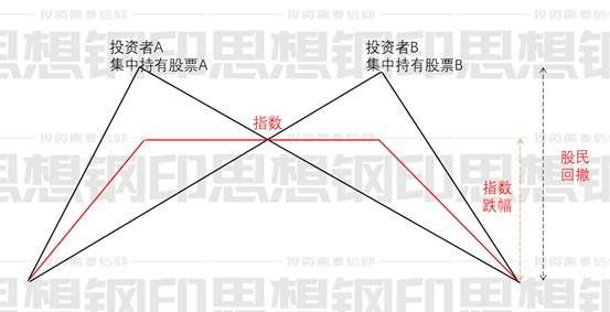 我们假设市场只有两个投资者。投资者A全仓持有股票A,投资者B全仓持有股票B,同样的道理,这两个投资者的回撤幅度均高于指数。
