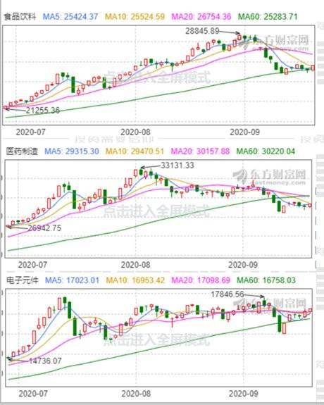 首先见顶的是最下方的电子元件,时间是7月中旬。但因为见顶太早了,在经历了最大15%的下跌后,反而在9月上旬再次创出新高。