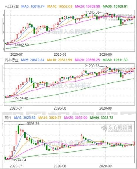更加复杂的是指数运行反过来也会对行业的走势产生影响,像8月末食品饮料行业的见顶,对正处于向上趋势的汽车、化工这些顺周期板块的走势产生了困扰,形成了一波明显的下跌。但一旦食品饮料下跌的影响消除之后,这些板块又很快出现了更凌厉的反弹,其中更强劲的汽车板块几乎已经要创出新高。