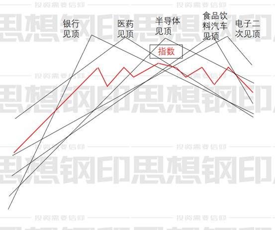 上述6个权重比较大,且风格各异的板块的轮流见顶,造成了指数从7月中旬到9月上旬的复杂的顶部形态。