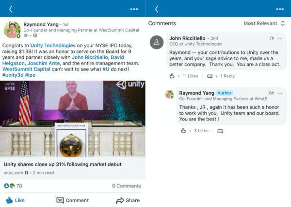 今天Unity 经过16年的 的发展从一个创业公司成为了华尔街的宠儿和超级独角兽。就在大家欢庆Unity 成功上市,股票飙升的当天上午,Unity 的CEO——John Riccitiello 先生在华山资本合伙人杨镭先生发的领英(LinkedIn)动态上发出了如下一段话: