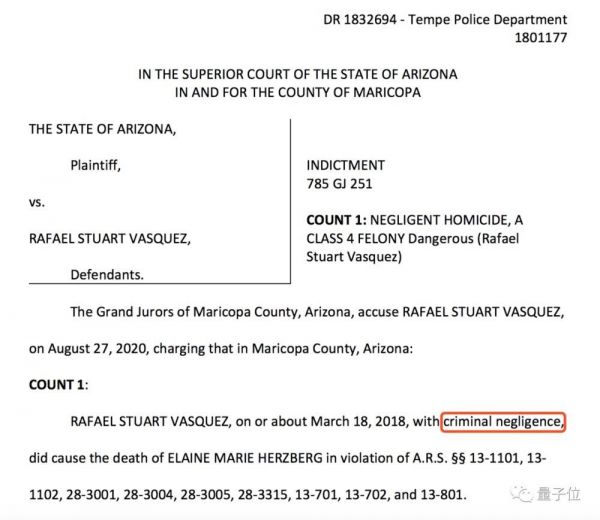 针对安全员Rafaela Vasquez的起诉书并不复杂。最重要的是这一句:2018年3月18日,Rafaela Vasquez因过失犯罪(criminal negligence)致人死亡。