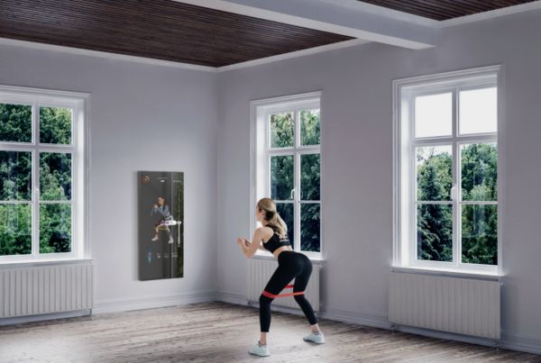 Fiture 有两款产品,一款产品侧重抗阻力训练,器械挂在墙上,屏幕提供录播课或者直播课和用户互动;另一款产品是一块穿衣镜设备,内容侧重徒手和操课训练。