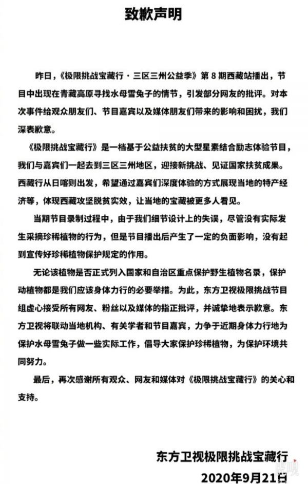 @虎嗅【极限挑战节目组致歉声明】9月21日晚,东方卫视极限挑战发布致歉声明,称节目中寻找水母雪兔子的情节引发部分网友批评,对此次事件给观众、嘉宾、媒体带来的影响和困扰深表歉意,并表示当期节目录制过程中,由于细节设计上的失误,尽管没有实际发生采摘珍稀植物的行为,但产生了一定的负面影响,节目组接受所有批评指正。