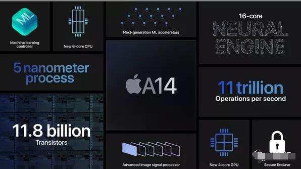 这次发布的A14处理器芯片上,神经引擎核心数再次翻倍达到16个,每秒运算次数达到了惊人的11.8万亿次,机器学习速度提升了70%,机器学习加速器则令运算速度快达10倍,将各种机器学习应用的性能表现再次大幅提升。