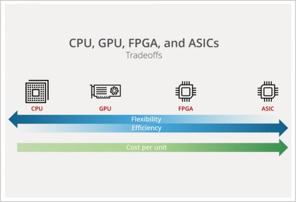 FPGA和ASIC不同,它们是一种专用芯片,没有指令集,也无需共享内存,而直接以并行和流水线的方式处理数据。不但速度快,功耗也低得惊人。