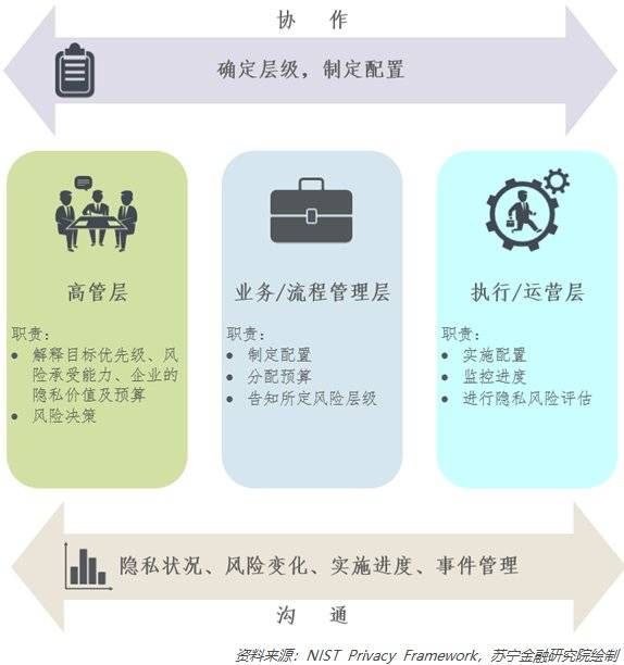 该隐私框架分为三个部分:核心、配置以及实施层,每个部分通过业务或任务驱动、组织角色和责任以及隐私保护活动之间的联系来加强企业对于隐私风险的管理。通过沟通和协作机制,来加强企业的隐私管理流程与问责。