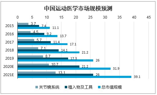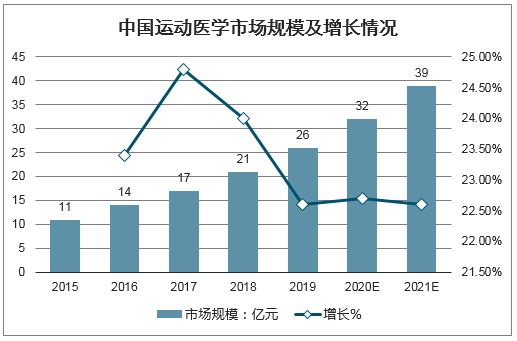 根据智研咨询发布的《2020-2026年中国健身运动APP行业发展动态及竞争策略研究报告》,2018年中国运动医学市场规模超过20亿,预计2021年将达到39亿,2015年至2021年市场规模预计年均复合增长率达到23.4%。