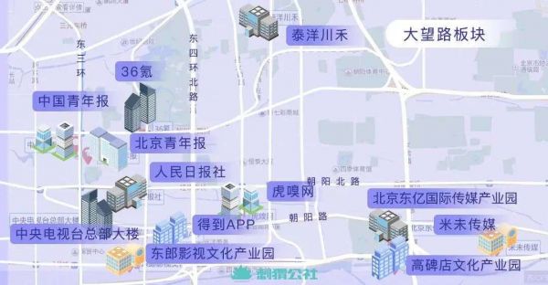 央视、人民日报两大“国字号”媒体,坐镇东三环与建国门外大街“黄金交点”;中国青年报、北京青年报、财新传媒、人物杂志等一众媒体分列东三环两侧;科技媒体中三大头部媒体,36kr、虎嗅和钛媒体也一度全都驻扎在东三环与东四环之间;一众影视、文娱、直播、知识付费、媒体等各类企业, 在通惠河两岸依次安营扎寨。