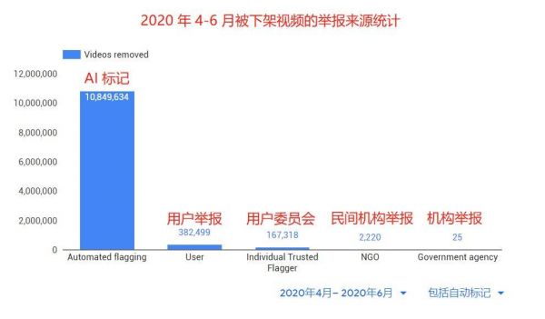 根据 Google 在定期的透明度报告中提到:在 2020 年 AI 接管内容审核的4月~6月中,共有 1100 万个视频被 AI 标记违规并下架,这些视频主要来自于美国、印度和巴西。