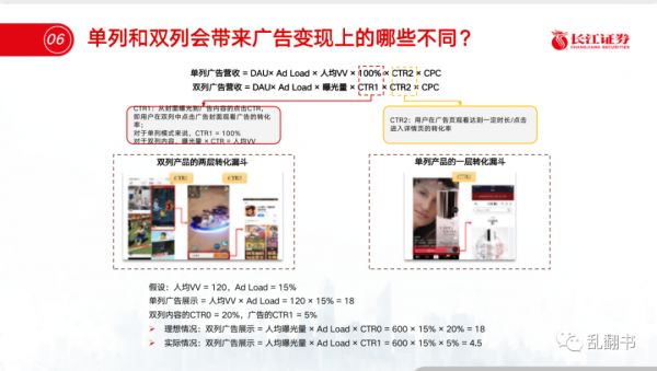 从用户的内容消费的链条来看,单列全屏产品用户无限下划浏览,不能选择是否能看到某个视频,广告可操作空间就是个确定的数字。双列信息流产品相比起单列全屏多了一层点击跳转,那么在广告商业产品的漏斗模型中,双列对封面图计价做点击和转化预估,要多加上一层从瀑布流到点击内容观看的CTR。