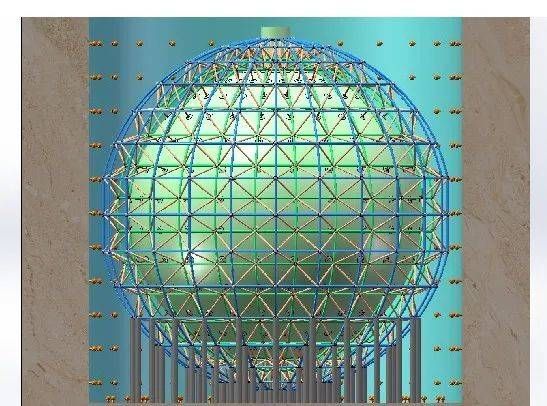 中央探测器的概念图像,由亚克力球体和不锈钢桁架组成。