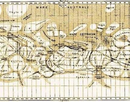 1877年,意大利天文学家“斯基亚帕雷利”(Schiaparelli)在通过望远镜观测火星时发现,火星表面存在着一系列纵横交错的直线状网络。他根据观测结果绘制了一幅详细的火星表面沟渠分布图,当时这些沟渠被称为“火星运河”。
