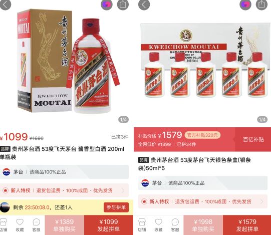 亦有低至1099-1579元单价的53度飞天茅台酒,包装为200ml或5瓶50ml,也需要拼团。目前200ml飞天茅台市场价约1400元。