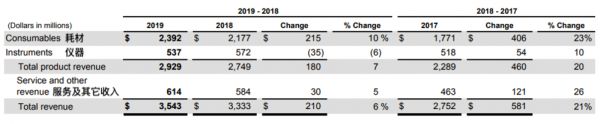 虽然该公司2019年收入有35.4亿美元,但较上一年仅增长了6%,远低于2018年21%的增长。仔细来看,耗材营收仅增长了10%,仪器营收甚至出现了负增长,服务及其它营收也几乎停留在了2018年的水平。