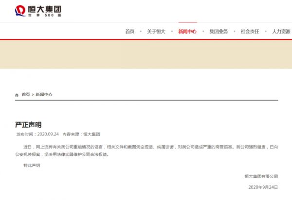 晚间,中国恒大发布声明称:近日,网上流传有关我公司重组情况的谣言,相关文件和截图凭空捏造、纯属诽谤,对我公司造成严重的商誉损害。我公司强烈谴责,已向公安机关报案,坚决用法律武器维护公司合法权益。