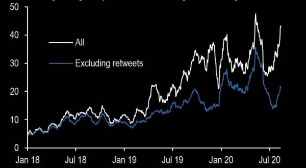 @新浪财经【美国总统特朗普的推文数量今年以来总体呈上升趋势,势将再创新高】美国总统特朗普的推文数量今年以来总体呈上升趋势,势将再创新高。下图为1个月滚动平均每日推文计数,蓝线为不包括转发的推文数量。