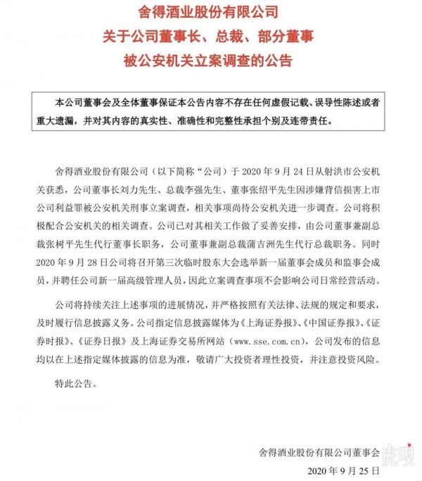 @虎嗅【ST舍得:公司董事长、总裁、部分董事被公安机关立案调查】ST舍得(600702)9月24日晚公告,公司当日从射洪市公安机关获悉,公司董事长刘力、总裁李强、董事张绍平因涉嫌背信损害上市公司利益罪被公安机关刑事立案调查,相关事项尚待公安机关进一步调查。公司将积极配合公安机关的相关调查。公司已对其相关工作做了妥善安排,由公司董事兼副总裁张树平代行董事长职务,公司董事兼副总裁蒲吉洲代行总裁职务。