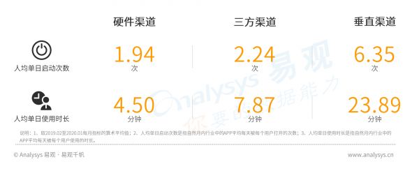 而且,从用户粘性方面来看,硬件渠道相比其他较低,工具性显著,用户在渠道平台内的停留时长有限;三方渠道虽然小幅优于硬件渠道,但仍具备一定的工具性。相比之下,垂直渠道的用户粘性则更有优势,用户使用数据明显高于其他渠道。
