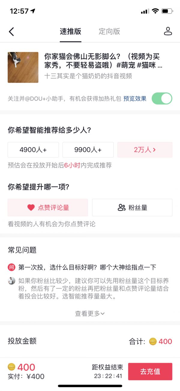 和钱相关,大家最关心的问题,肯定是价格,根据粉丝的测试,目前视频号推广400元在3天内可以获得2w的曝光量,并根据视频内容,系统智能匹配人群。