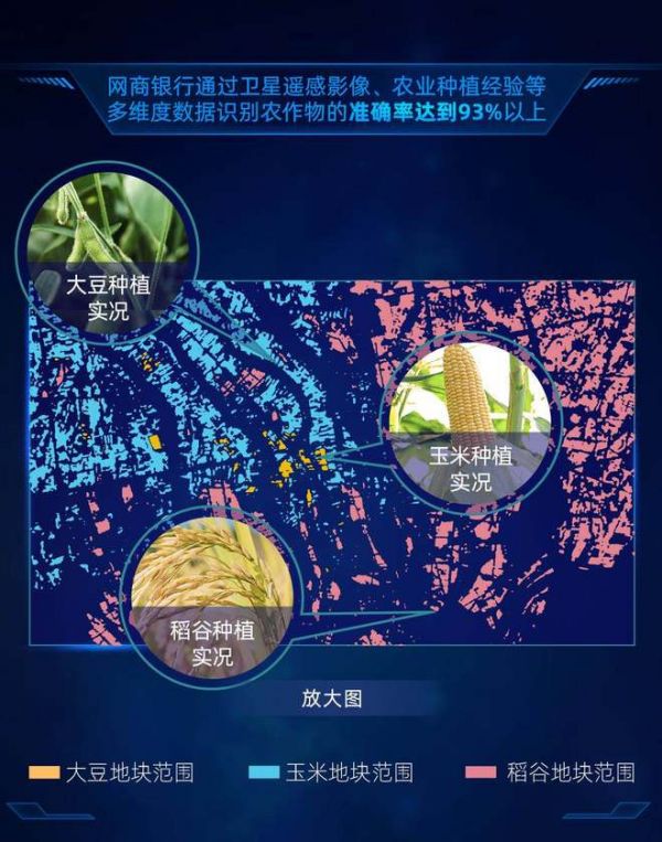 卫星解决了这一难题。“农户可以拿着手机,绕地走一圈,或是在支付宝上把自己的地在地图上圈出来,卫星就可以去识别这块地的农作物面积、作物类型,分辨出水稻、玉米、小麦、花生、烟草等多种作物的区别,目前准确率已达到93%以上。农户圈出的地块是否准确,也可以和农户在政府机构登记的土地流转、农业保险等数据进行交叉验证。”网商银行农村金融首席算法专家王剑解释道。
